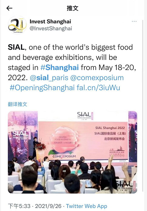 上海外商投资促进服务平台(Invest Shanghai)为SIAL 2022 国际食品展(上海)点赞