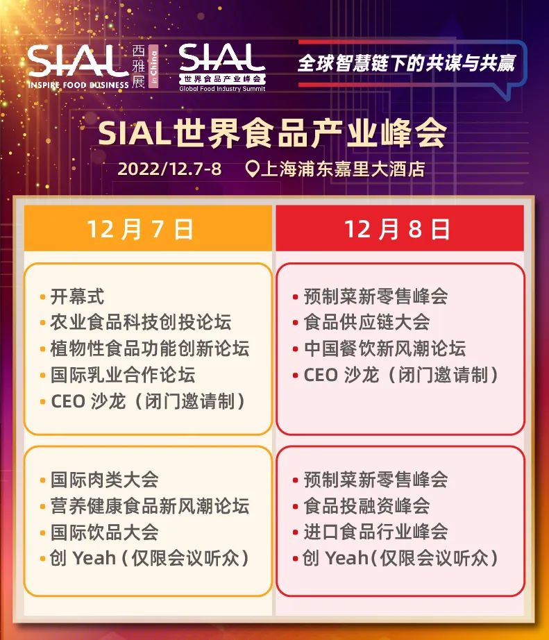 SIAL世界食品产业峰会将于2022年12月7日-8日如期举办!峰会将以“全球智慧链下的共谋与共赢”为主题举办包含预制菜、新零售、供应链、农业食品科技、食品投融资、营养健康食品、植物性食品、乳业、肉类、饮品、中餐、进口食品在内的多场主题论坛。